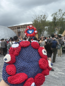 写真は、我が娘ゾンゾンが万博に行った時の写真です。万博用に自分で編み込んだ帽子を被って会場を訪れたそうです。