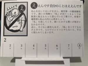 今週のあきんどカルタ週めくりカレンダーは「え」です。一番気に入っている「ええんです 自分のことはええんです」なので、お出かけ前に気分があがります。
